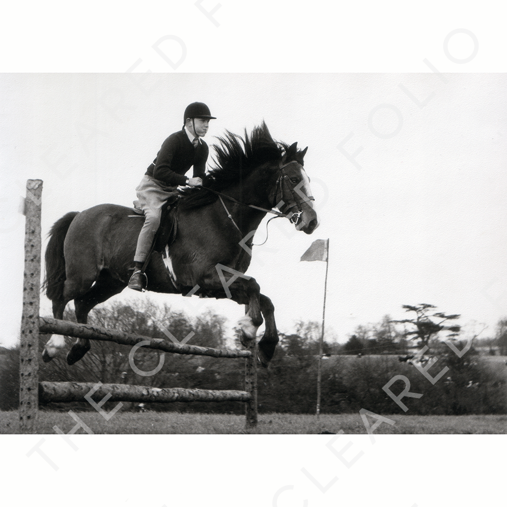 B/W Photograph, 1960s boy on jumping horse, portrait
