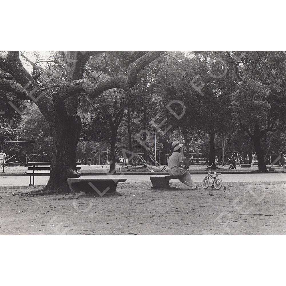 B/W Photograph 1970s mother in a park with bike