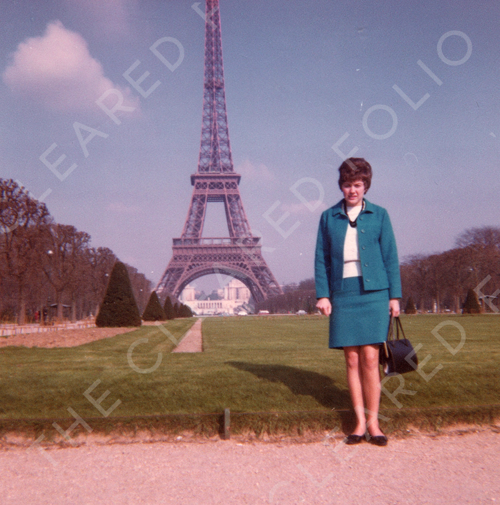 Title: Colour Photograph 1970s young woman by Eiffel Tower, Paris